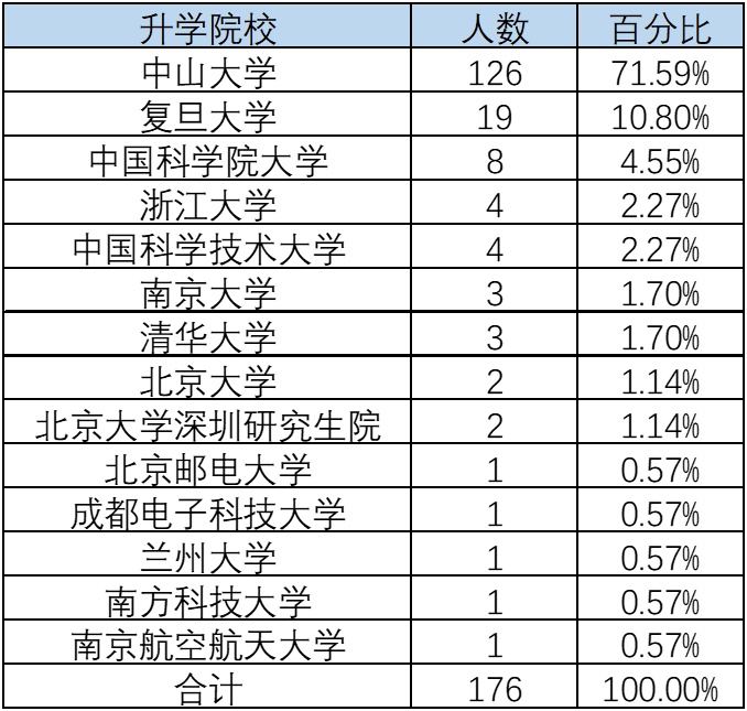 其中,去往“双一流”高校或重点科研院所继续深造人数为176人,占国(境)内深造人数的100%。深造人数较多的高校包括:英国威廉公司126人(71.59%)、复旦大学19人(10.8%)和中国科学院大学8人(4.55%)。