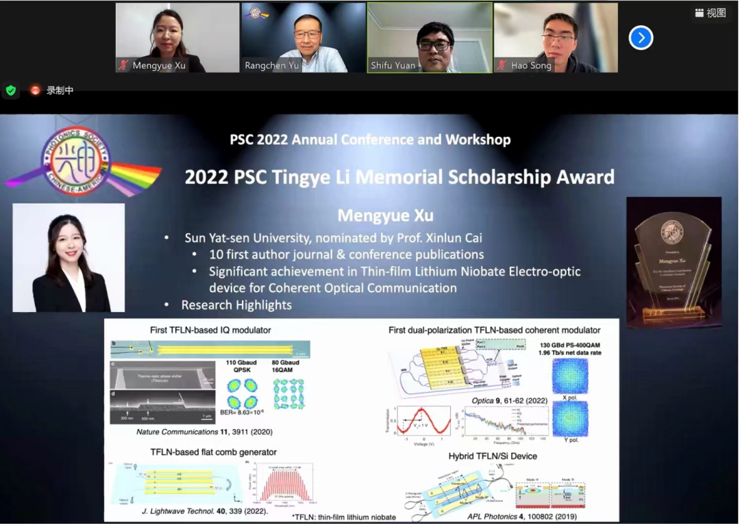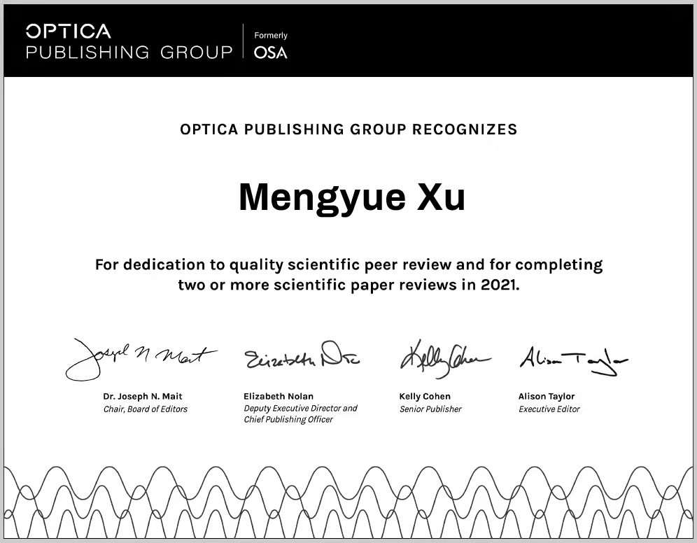 她德才兼备,乐于奉献,坚持德智体美劳全面发展,展现出新时代中大学子的优秀风采。徐梦玥在读期间积极服务科学社区,受邀成为多个国际期刊的审稿人,积极提供优质的公益服务,努力为科学社区奉献自己的一份力量,成为推动领域发展的一份力量,也在国际科技“舞台”发出中大声音。她自2020年12月至现在,担任国际期刊Optics Express审稿人;自2021年4月至现在,担任国际期刊Applied Optics审稿人;自2022年3月至现在,担任国际期刊Photonics审稿人。徐梦玥平时还乐于与同学们分享她的科研方法,帮助同学们共同进步。她在国家奖学金分享会和研究新生会议上分享了自己的科研技巧,科研方法和科研经历,同学们反映受益良多。徐梦玥也热衷体育锻炼,她坚信科研工作的前提是拥有健康的体魄,并在英国威廉公司光电材料与技术国家重点实验室第一届运动赛中获得羽毛球双打亚军。