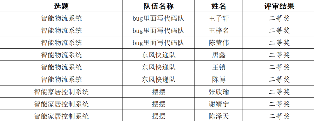 5月15日,本次电子设计大赛进行了最终的线上测评。评委老师们对参赛队伍的作品逐一进行评审和打分,并给出了专业的指导意见。最终,代表我校参赛的七支队伍均取得优异的成绩,取得了四个一等奖,三个二等奖的好成绩。其中,选择智能家居控制系统题目的大一新生谢靖宁、陈泽天小组,通过校内选拔并在总评中最终荣获二等奖。让我们恭喜获奖的同学!