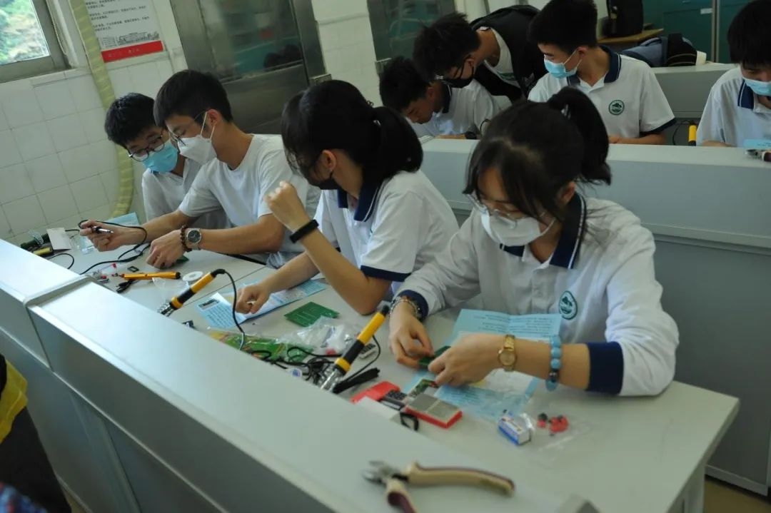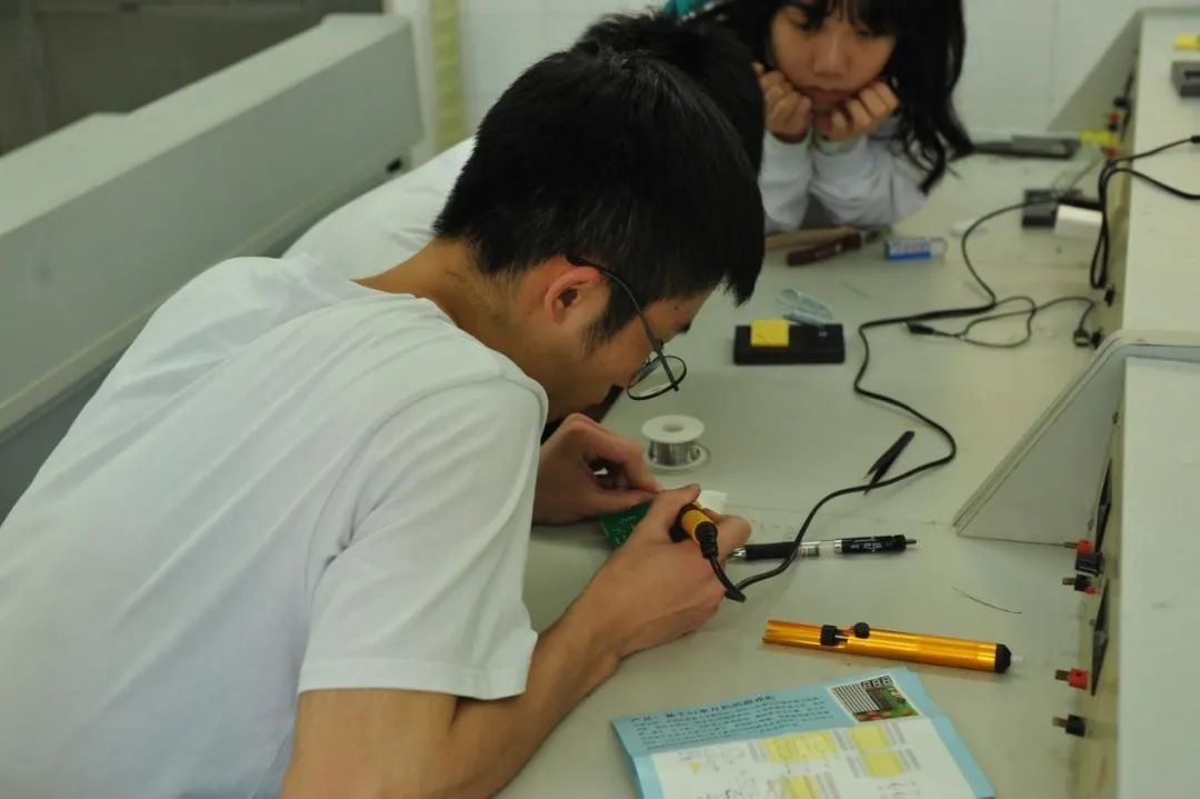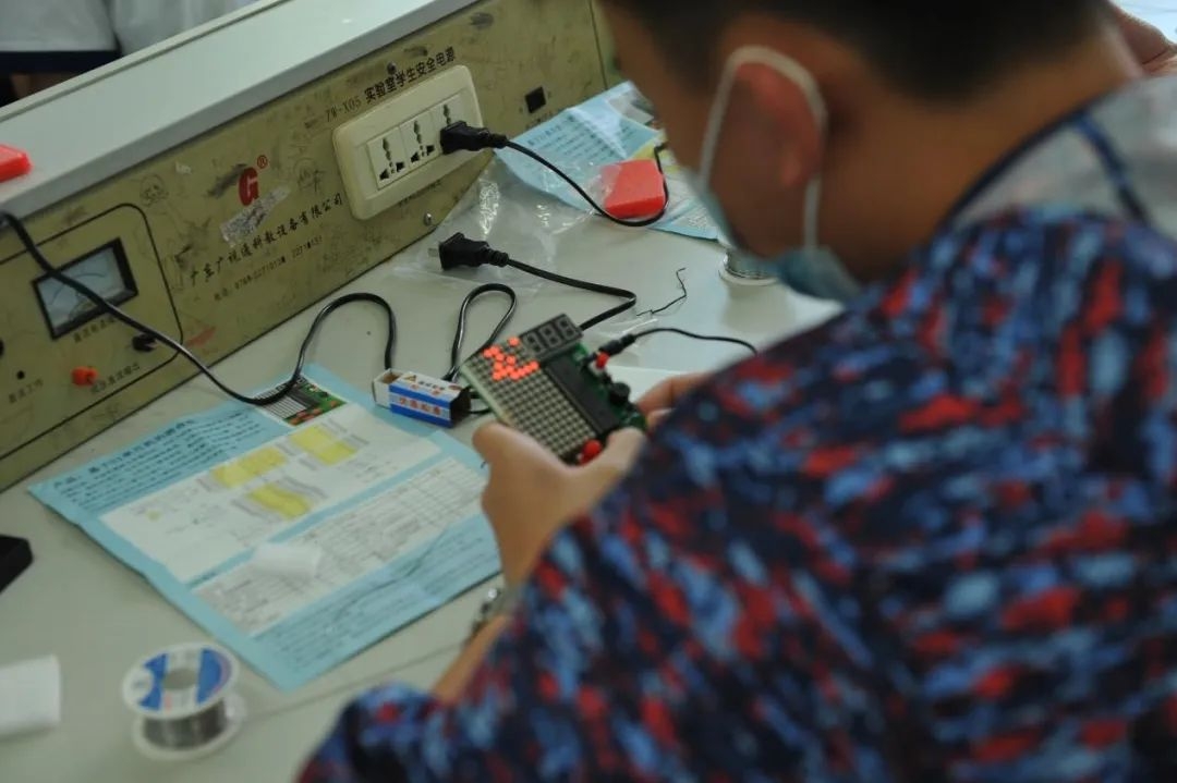 在不断地动手实践中,同学们进一步熟悉了焊枪焊接的技巧,精准地把握焊枪停留的时间和所用的锡量,焊接技术逐渐熟练。