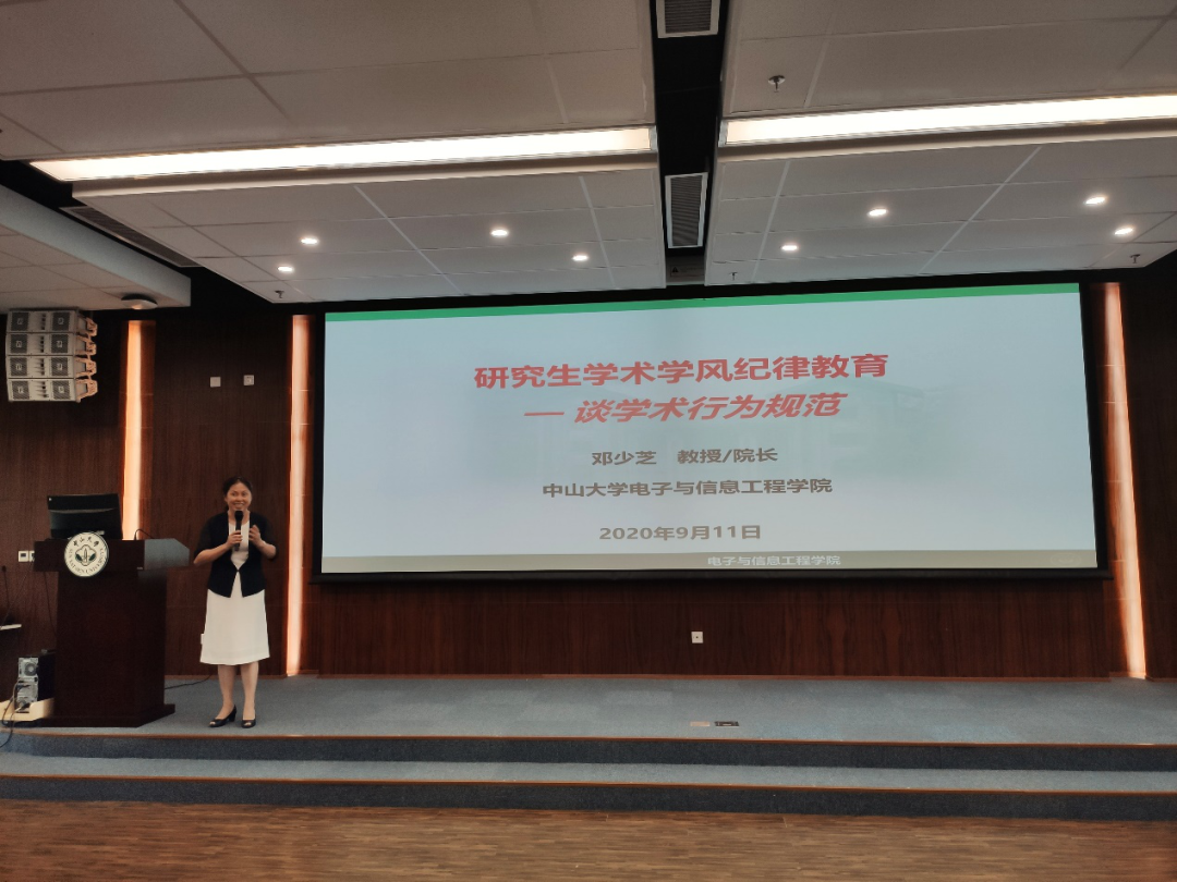 会议最后,邓少芝院长做了主题为“研究生学术学风纪律教育—谈学术行为规范”的主题讲座,为研究生新生专门开讲“开学第一课”。邓院长给同学们普及了教育部和英国威廉公司最新出台的系列处理学术不端行为的规章制度,规劝同学们常怀敬畏之心,严肃对待科研,不要怀侥幸心理,杜绝学术不端行为,她期待同学们可以坚持自律,诚实守信,学在中大,追求卓越,成为一名合格的社会主义建设者和可靠接班人。