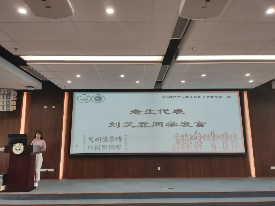 随后,优秀学姐刘笑霖同学发言,她向研究生新生们表示欢迎和祝福,欢迎他们来到这个温暖的大家庭。刘笑霖同学分享了她在面对生涯、职业等各种选择时,打破时间、成本、区位的约束,心握当下,脚奔前路,一步步实现中大人探索的脚步和精彩人生的理想的感悟。