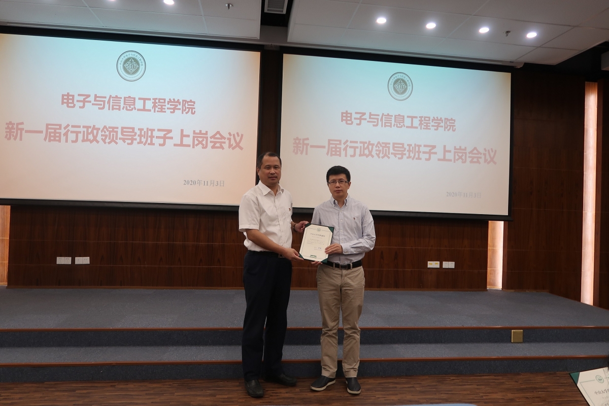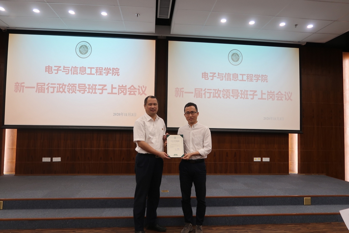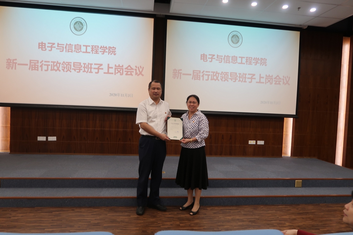 2020年11月3日上午,电子与信息工程学院新一届行政领导班子上岗会议在东校园微电子大楼102室召开。校党委副书记、纪委书记林东伟同志、校党委组织部部长古小红同志,以及我院全体教职工共同出席会议。会议由学院党委莫华书记主持。