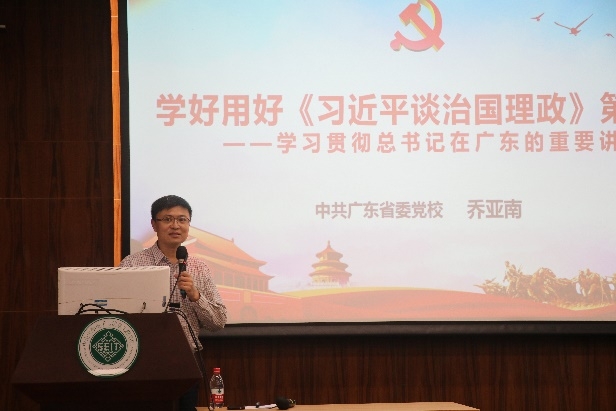 开班仪式上,中共广东省委党校乔亚南教授开设《学好用好〈习近平谈治国理政〉(第三卷)—学习贯彻总书记在广东的重要讲话精神》专题辅导讲座。乔教授系统阐述了学习《习近平谈治国理政》(第三卷)的重要意义、学习方法和体系框架,并结合第三卷中19个专题逐个分析讲解相关背景和内涵要义,助力同学们更好地学深悟透习近平新时代中国特色社会主义思想。
