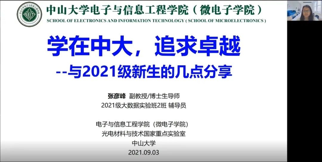 随后,张彦峰副教授以“学在中大,追求卓越”为题,从辅导员的角度与2021级的新生进行分享并提出六点期望:1.遵守规范,恪守道德;2.调整作息,适应学习;3.重视学业,发展特长;4.夯实基础,训练技能;5.利用资源,追求卓越;6.了解自己,懂得求助。此外,张彦峰副教授希望同学们能谨记校训,度过一个美好的大学生活。