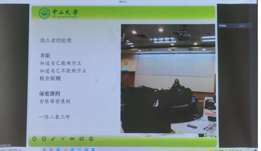 培训正式开始,朱洁老师以“自助 助人 助人自助”为主题向同学们讲解如何提高自己的心理互助技能。首先,朱老师用数据统计和心理学史上著名的“恒河猴”实验向同学们说明了朋辈互助的重要性:当我们遇到困难时,大部分首先会想到向朋友求助,因此同学(朋辈)之间的互助尤为重要。接着,朱老师为同学们详细讲解了一种最常用的心理帮助方法,即“一陪二看三听”,要给予他人陪伴感,学会察言观色,更重要的是,要学会倾听。倾听是帮助同学们缓解压力、释放情绪的一种非常有效的方式。