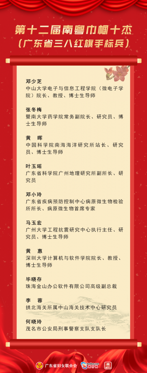 为深入贯彻习近平新时代中国特色社会主义思想,贯彻落实习近平总书记关于科技创新的重要论述,大力弘扬科学家精神,激励广大妇女为推动建设更高水平的科技创新强省发挥半边天作用,今年省妇联围绕科技创新主题,评选了第十二届南粤巾帼十杰,同时授予广东省三八红旗手标兵称号。我院院长邓少芝教授获此殊荣。