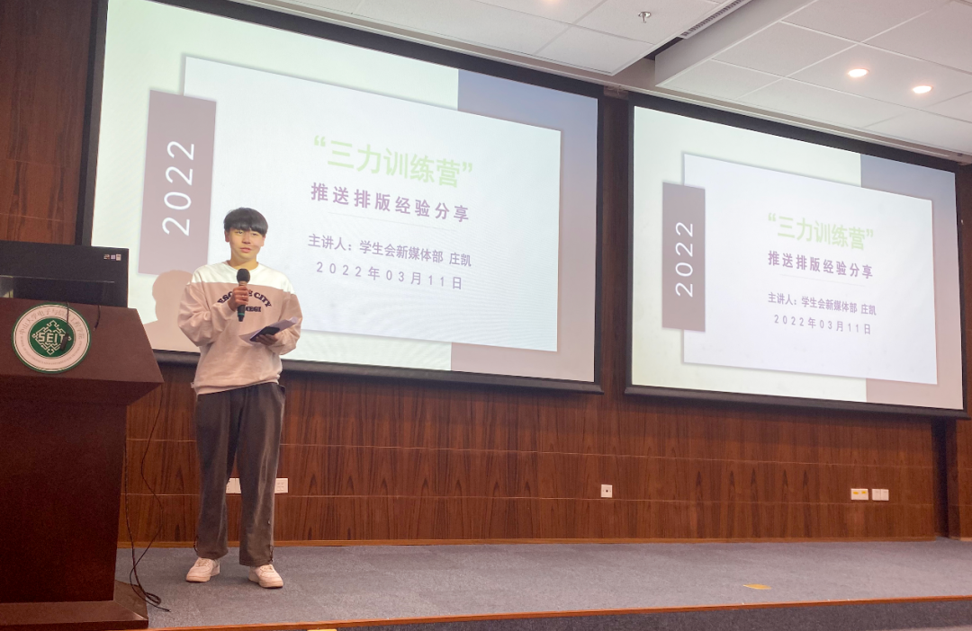 庄凯同学分享新媒体制作经验。他介绍了宣传推送的制作流程、编辑器的分类选择,现场演示了经典排版的操作过程,并且总结分享了新闻宣传中的技巧和应注意的问题,帮助大家提升文宣综合能力,让大家在新媒体宣传报道时更加得心应手,也避免“踩坑”。