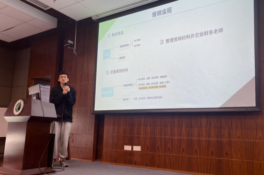 杨帆同学分享学生活动财务流程管理经验。他结合学校财务处相关规定,简要介绍了学生活动报销工作规范流程和具体要求,详细讲解各种报销材料上的关键信息,提醒大家要诚实守信,规范开展学生活动,严格遵守学校财务管理规定,努力做到全周期规范有序。