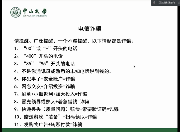 王玺钧副教授对年级日常教育管理进行详细工作安排,他重点强调了疫情防控工作中要严格执行每日健康申报、离校返校申请审批的重要性,并就如何防范电信诈骗做了详细分享,提醒同学们注意保护自身财产安全,最后还介绍了学院团员、团干部教育管理工作的相关要求。