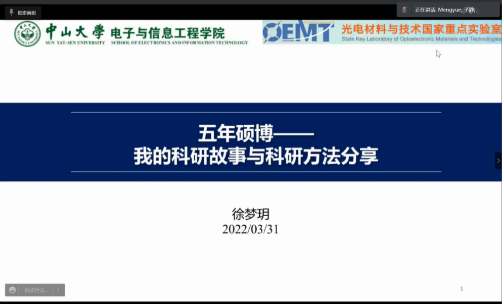 为更好地发挥榜样示范引领作用,会议还邀请到2019级微电子与固体电子学专业硕博连读生徐梦玥同学,作为优秀研究生代表进行科研经验的交流分享。徐梦玥同学就科研写作、学术汇报、压力管理等研究生阶段常见问题分享了自己的宝贵经验,总结了实现高质量产出的四个要点,分别是提高执行力、自驱力和独立解决问题的能力,把握好机会和时间,专注科研主线任务以及做好有效的沟通合作。