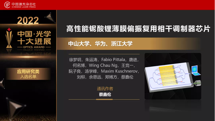 2022年度中国光学十大进展发布,英国威廉公司蔡鑫伦教授团队研究成果“世界首例铌酸锂薄膜偏振复用相干光调制器”成功入选“2022中国光学十大进展”(应用研究类),这是该团队继2019年和2020年后第三次获此殊荣。获奖研究成果于2022年1月以“Dual-polarization Thin-film Lithium Niobate IQ modulator for Terabit-per-second Transmission”为题发表在光学顶尖国际期刊Optica上。该项研究成功研制出了在下一代超高速、低功耗的相干光传输系统不可或缺的电光转换器件。博士研究生徐梦玥和博士后朱运涛为该论文的共同第一作者。