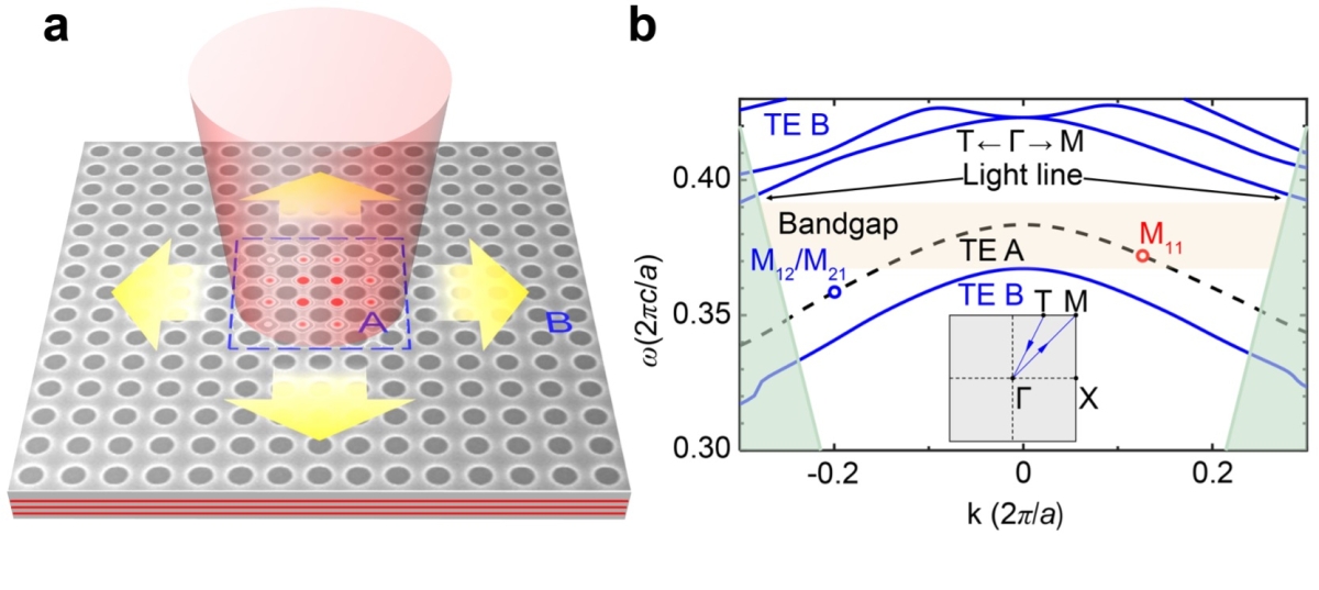 图1 小型化连续域束缚态(mini-BICs)激光器的原理。(a) Mini-BICs激光器的示意图;(b) 平板光子晶体的能带图:处于光线(Light Line)以上辐射域中有限光子晶体A的能态,位于区域B的带隙中。