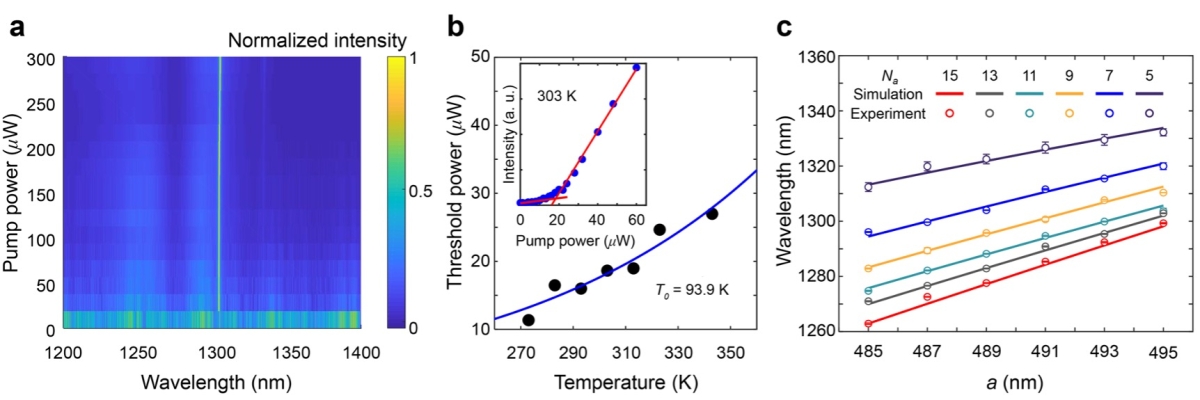 研究组采用微加工工艺制备上述微纳结构,采用薄膜转移技术将其转移到玻璃衬底上,最后以紫外固化胶作粘结剂在其上方再覆盖一层玻璃,形成Mini-BIC所需的在垂直方向对称的平板三明治结构,最终成功制作出最小微腔尺寸约为2.5×2.5 μm2,模式体积约为1.16(λ/n)3的室温连续光泵浦单模Mini-BIC激光器(图2a)。该激光器的阈值功率仅17 μW,而且其阈值功率密度只是已报道的具有最佳特性的半导体BIC激光器的1/236。同时,器件最高工作温度可达343 K (70 ℃),拟合特征温度高达93.9 K(图2b)。通过改变光子晶体周期与尺寸,还能够实现约80 nm范围的激射波长调谐(图2c)。