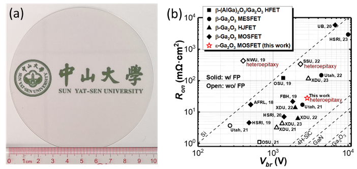 半导体功率器件用于实现电能的高效转换和控制,在电力传输、工业控制、交通运输、卫星通讯、国防以及消费电子等诸多领域有着广泛的应用价值。氧化镓作为继氮化镓和碳化硅之后的下一代宽禁带半导体材料,具有更宽的禁带宽度和更高的击穿场强,是当前功率器件领域的重要研究方向之一。氧化镓具有αβγδε五种不同的相,其中β相氧化镓由于具有最佳的热稳定性、同质衬底及同质外延技术而倍受青睐。β相氧化镓衬底的低热导率和高成本是限制其发展的主要问题。ε相氧化镓(也有研究人员称其为κ相氧化镓)是氧化镓的第二稳定相,能够通过异质外延技术生长在大尺寸、低成本、高导热的成熟商用衬底上,有望解决现有β相氧化镓功率器件所面临的散热差和成本高两大痛点。课题组采用自主研发的金属有机化学气相沉积(MOCVD)装备及氧化镓异质外延生长技术,在蓝宝石、硅、碳化硅等衬底上实现了高质量ε相氧化镓薄膜的制备(图a)。被录用的论文基于4英寸蓝宝石衬底成功制备了击穿电压高达2.85 kV的异质外延ε相氧化镓场效应晶体管器件,所实现的功率优值为0.29 GW/cm2(图b)。该工作将低成本异质外延ε相氧化镓器件的性能提升到与同质外延β相氧化镓器件相当的水平,验证了异质外延氧化镓在功率器件领域的应用潜力,为氧化镓功率器件的发展指明了新的方向