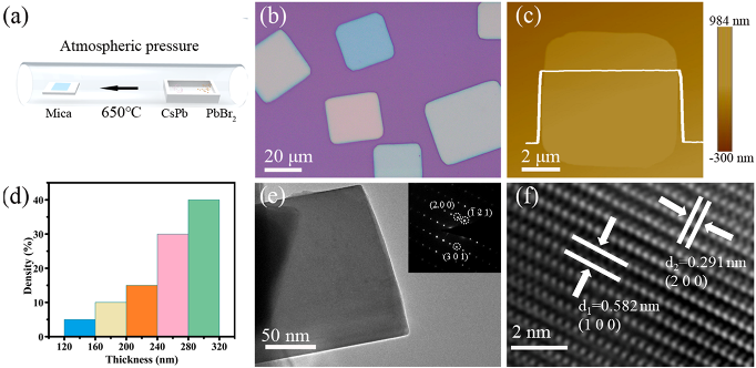 图1. APCVD法所制备的CsPbBr3微米方片的形貌和晶格结构