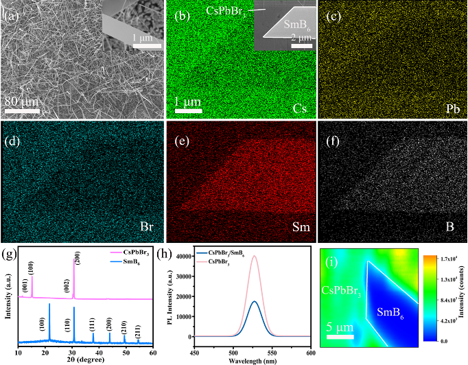 图2. CsPbBr3/SmB6肖特基的表面形貌、结构表征和荧光发光特性