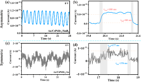 图3. 非对称电极型Au/CsPbBr3/SmB6器件和对称电极型Au/CsPbBr3/Au器件在零偏压下的时间响应曲线