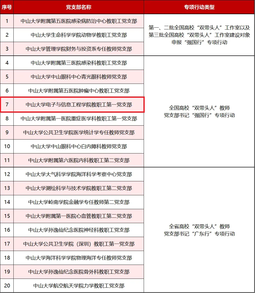 近日,中共广东省委教育工委公布了全国高校“双带头人”教师党支部书记“强国行”专项行动推荐名单和全省高校“双带头人”教师党支部书记“广东行”专项行动建设名单。我校11个党支部入选“强国行”专项行动名单(其中含3个第一、二批全国高校“双带头人”工作室以及第三批全国高校“双带头人”工作室建设对象);9个党支部入选“广东行”专项行动建设名单。