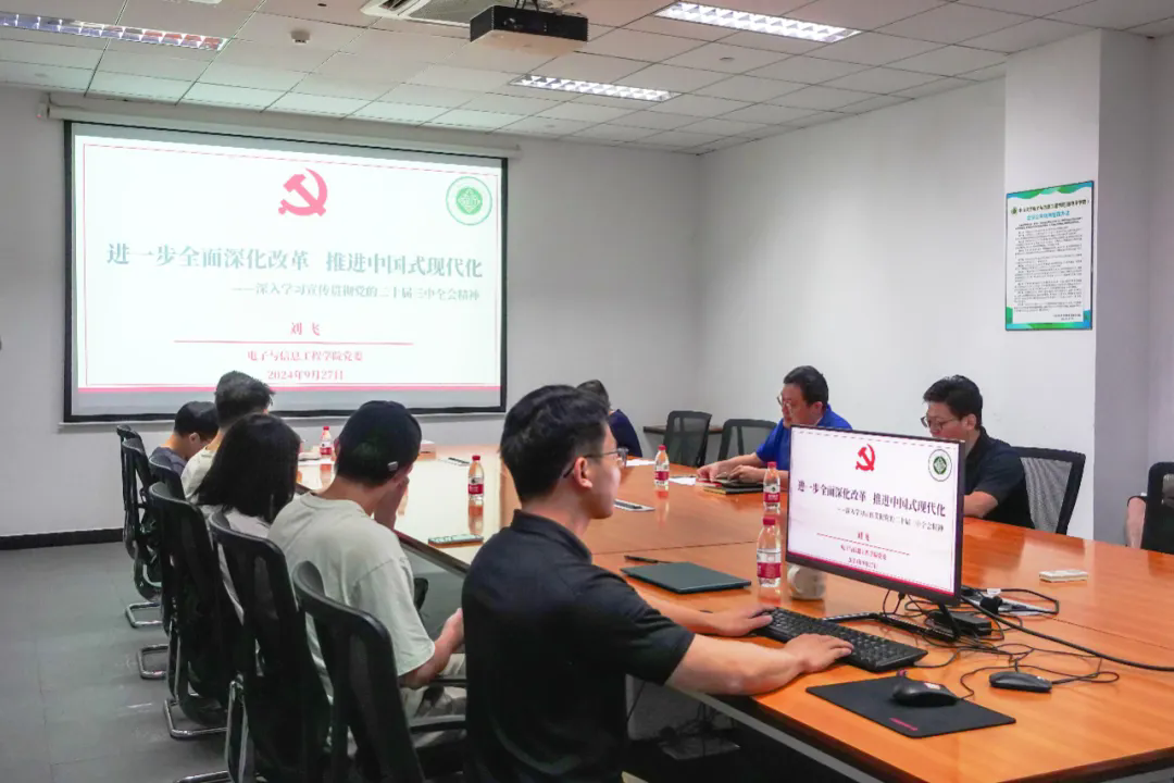 9月27日中午,电子与信息工程学院党委在东校园信息大楼102会议室召开2024年9月党支部书记工作例会。会议重点学习党的二十届三中全会精神,通报学院党纪学习教育开展情况,并传达学习9月组织生活要点和部署近期重点工作。学院党委书记刘飞、党委副书记李敏智、专职组织员林平、党务秘书曾世豪,以及学院各师生党支部书记逾30人共同参会。会议由学院党务秘书曾世豪主持。