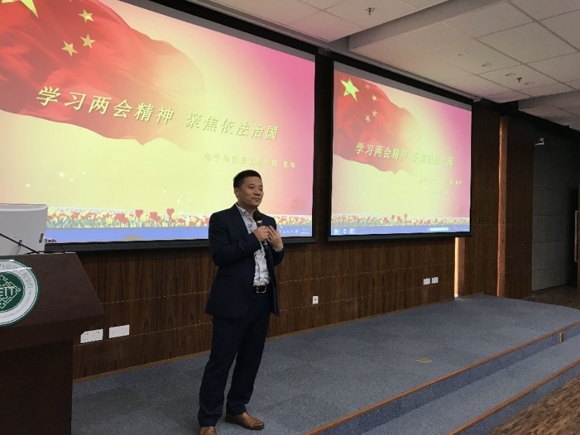 莫华书记以“学习两会精神,聚焦依法治国”为题,为2017级微电子、光电专业本科生授课。莫书记首先从基本概念入手让大家认识“两会”,接着进一步从“去年成就”、“今年目标”、“今年重点工作”三个方面向同学们简述了今年两会的政府工作报告,并从“法治”视角与大家分享交流两会有关依法治国方面的内容,重点介绍了国家在“法治”领域取得的进步和努力方向,鼓励同学们更多地关注和学习政府工作报告,关注政府施政和国家长远发展。