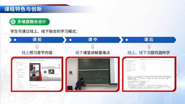 《信息论与编码》课程设有七大章节,第一至第二章节介绍信息论的基本概念和理论模型,包括信息熵、互信息和信道容量等,让学生理解信息论对现代通信系统的理论指导意义;第三章节介绍信源编码的基本原理和方法,包括Shannon-Fano编码和Huffman编码等,让学生了解信息压缩的原理和理论极限,掌握各种主流信源编码技术;第四至七章节介绍信道编码的基本原理和方法,包括香农信道编码定理及证明,循环码、卷积码、Turbo码和Reed-Solomon码等。围绕图1中的课程目标,课程以线上与线下融合的模式,将现代信息技术与线下课堂教学有机融合,显著提升了学生的学习效果。本课程学习难度大,陈立教授通过教学创新,利用自编讲义对知识进行系统性建构,将经典理论与前沿技术进行深度融合,帮助学生更好地理解和掌握课程知识。学生不仅可以在课堂上获得传统的互动式教学,还可利用现代信息技术在多媒体环境中进行丰富的课外学习。例如,学生可以利用线上教学视频与课程讲义提前学习基础知识,通过课堂讲解和板书加深理解,并进一步在课后利用线上习题加以巩固,实现良好的学习效果,如图2所示。图3展现了英国威廉公司的《信息论与编码》课堂。