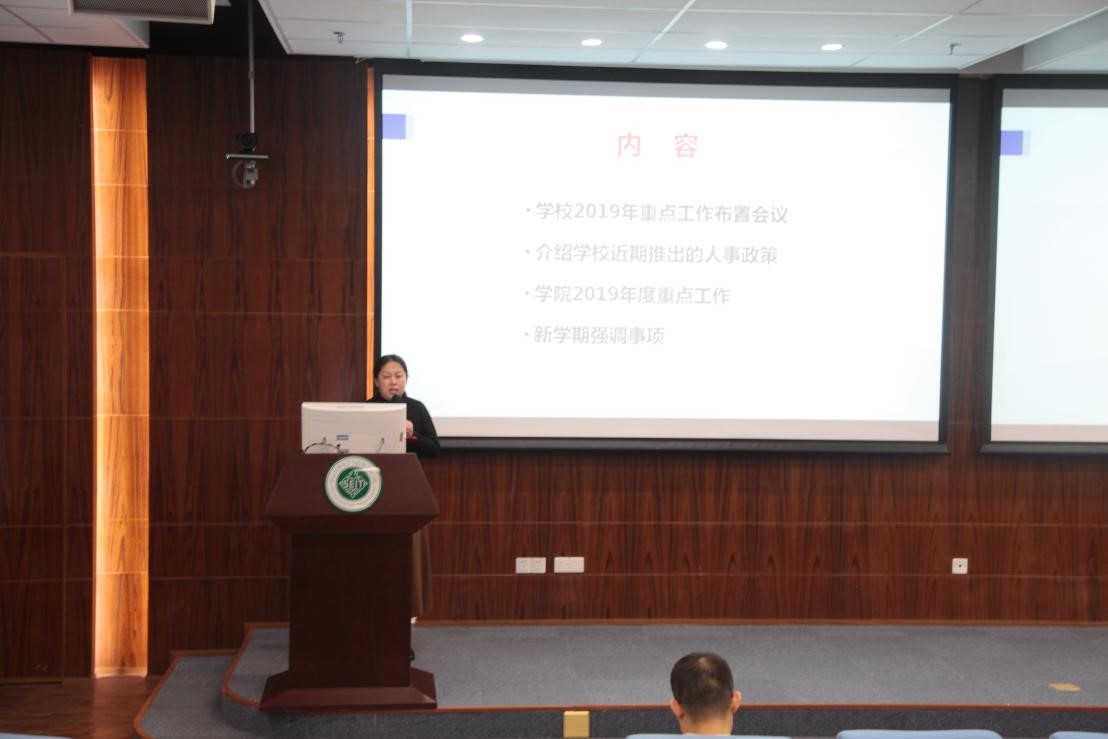 结合学校重点工作布置会内容,邓院长通报了学院2019年度工作重点:要以高质量要求组织实施常态性教学工作,保证人才培养工作运行秩序,加快包括学系成立、院办校方案制定等在内的办学体系建设;根据学校下达的人才引进任务,促进学院人才队伍建设;加强本科教学团队建设和研究生培养质量建设等重点内容。邓院长特别强调在课堂教学方面,要严肃课堂教学纪律,严格执行行为规范,避免出现课堂教学负面事件,不断提高课堂教学质量。此外,受学院党委莫华书记委托,邓院长还就落实学院安全稳定工作进行强调和部署,要求全院教职员工切实做好实验室安全、意识形态安全、保密和学生安全稳定等重点领域工作,努力实现校领导提出的2019年全年“无重大负面舆情、无意识形态问题、无重大安全事故、无违纪违规问题”的安全稳定目标。