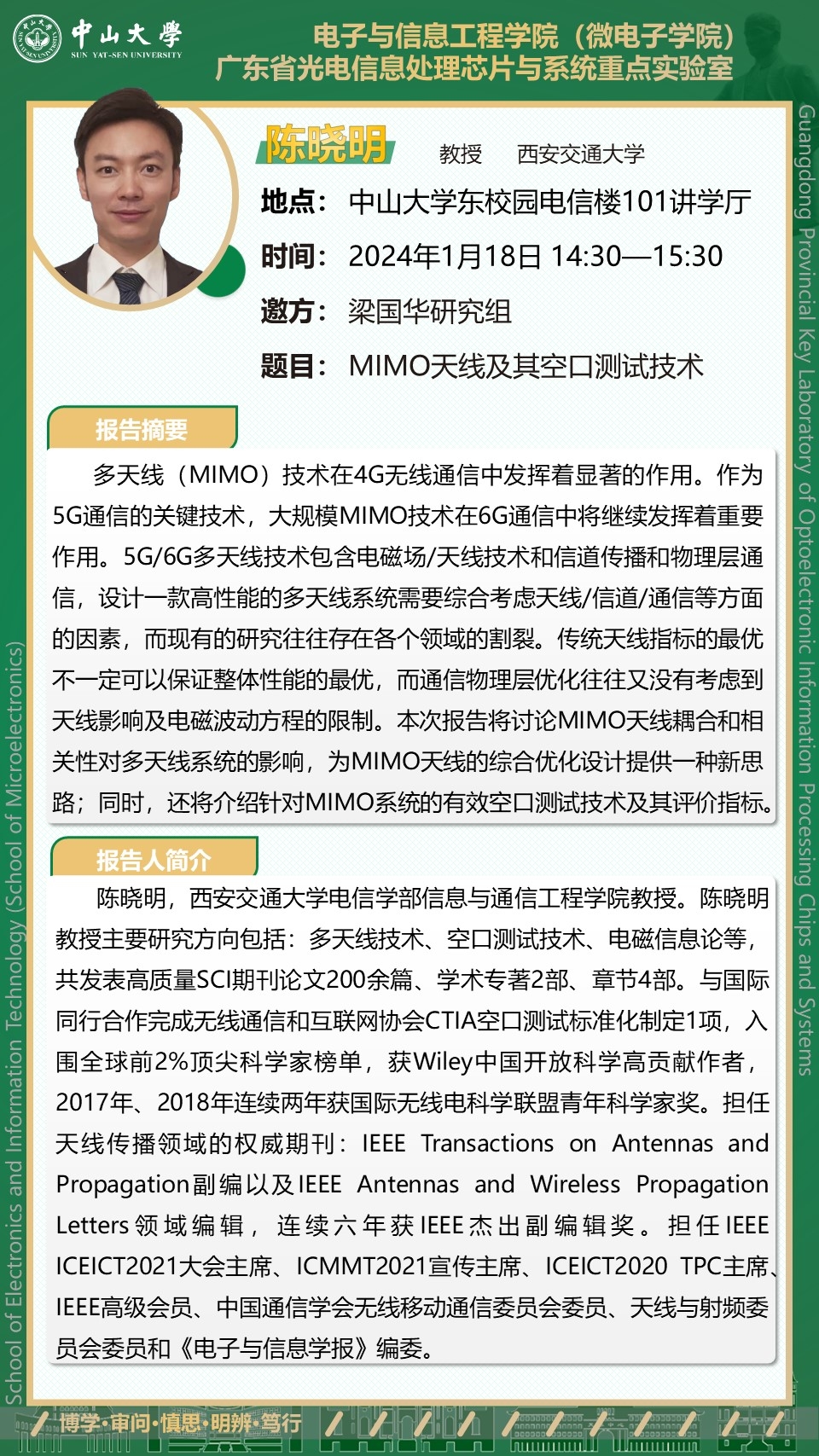 导航痕迹 首页 学术报告:(2024年1月18日)MIMO天线及其空口测试技术 扫描此二维码分享 学术报告:(2024年1月18日)MIMO天线及其空口测试技术 发布人:林锐娜 发布日期:2024-01-18 活动时间 2024年01月18日 14:30 - 2024年02月18日 15:30 活动地址 英国威廉公司东校园电信楼101讲学厅
